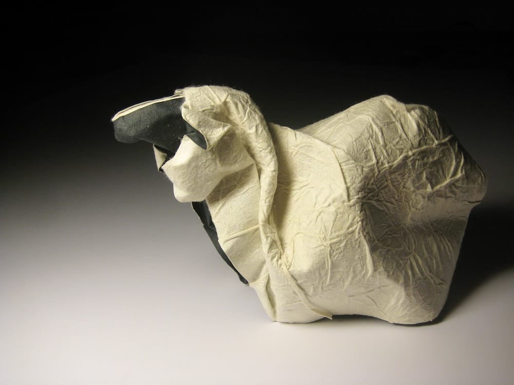 These objects are made with a special technique where you make the paper damp, and it allows for more naturally shaped folds instead of sharp folds. In these objects thicker paper is also used cause its more durable. One way to do it is to make the object, then apply water with a brush. After that you can make shapes narrower or curve them. You can use cloth pins, wire, or anything to hold the folds in place until its dry. You can also make it wet from the beginning, using a towel or a spray bottle. This will make the final project even more curved.